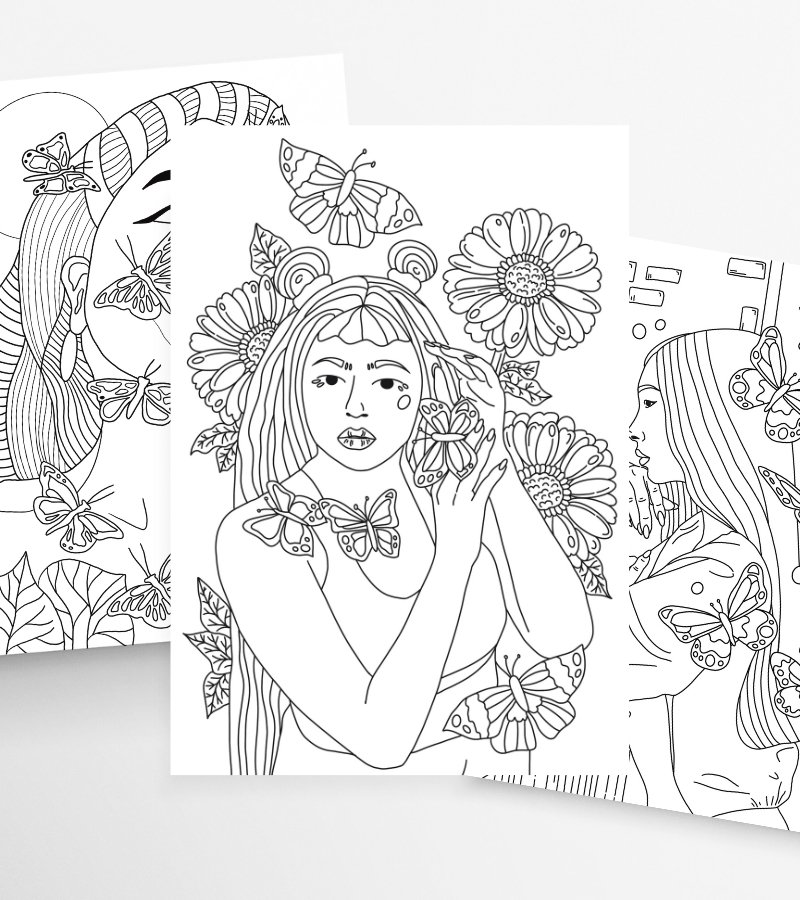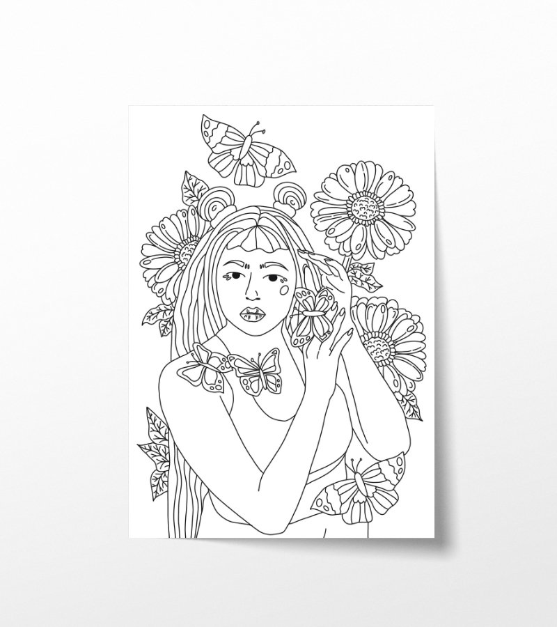 Kleurplaat Mira is een prachtig vrouwelijk portret met een sierlijke achtergrond van bloemen en vlinders. De verfijnde lijnen en dromerige details maken deze illustratie perfect voor een ontspannen en creatief kleurmoment.